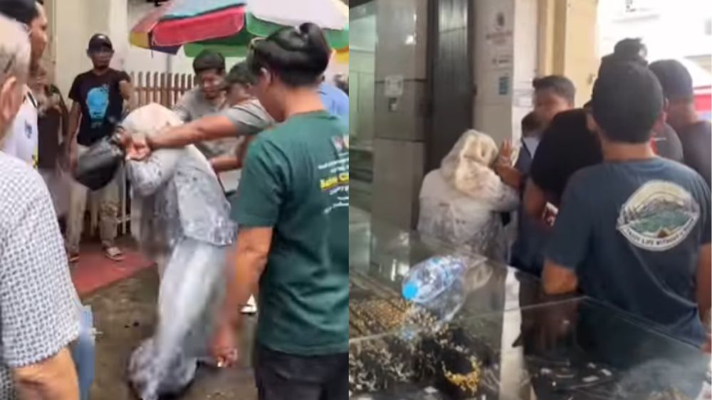 Emak-emak nekat lempar bom molotov ke toko emas Makassar, warga panik tapi sigap amankan pelaku. Motif masih misterius!/Kolase Bacakoran.co--Instagram @medsoszone
