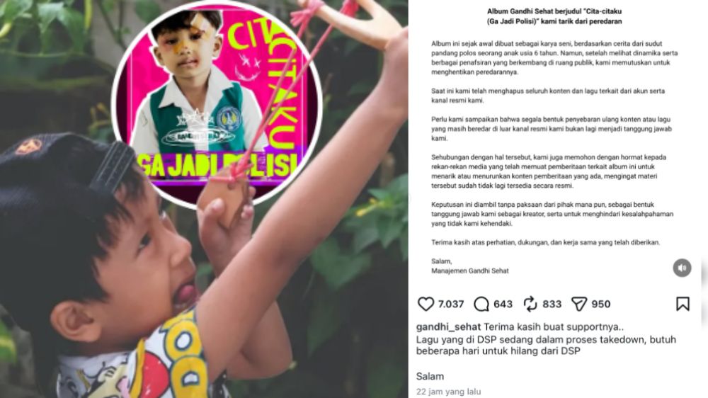 PALEMBANG, BACAKORAN.CO – Jagat musik tanah air kembali dihebohkan oleh kabar penarikan lagu “Cita-citaku (Ga Jadi Polisi)” karya bocah berusia 6 tahun asal Sleman, Yogyakarta, Gandhi Sehat.