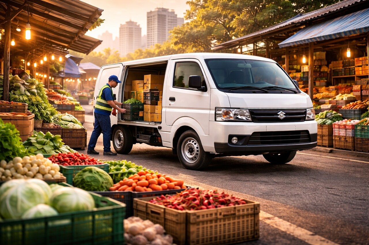 Suzuki Carry Minivan 2026 mengangkut logistik di pasar, menjadi kendaraan niaga andalan UMKM berkat muatan besar dan mesin tangguh.--AI