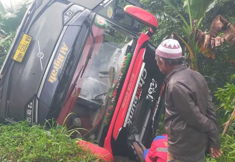 BACAKORAN.CO -– Sebuah bus penumpang Antar Kota Antar Provinsi (AKAP) dengan nomor polisi BA 7025 WBU, tujuan Jakarta - Padang, Senin dinihari 16 Maret 2026 sekira pukul 02.30 WIB mengalami kecelakaan lalulintas, terbalik masuk jurang.
