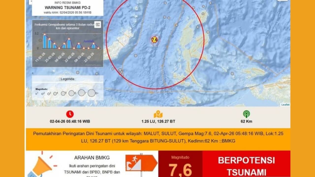 BACAKORAN.CO - Gempa bumi dengan kekuatan magnitudo (M) 7,3 mengguncang wilayah Bitung, Sulawesi Utara (Sulut) pada Kamis, 2 April 2026, pukul 05.48 WIB.