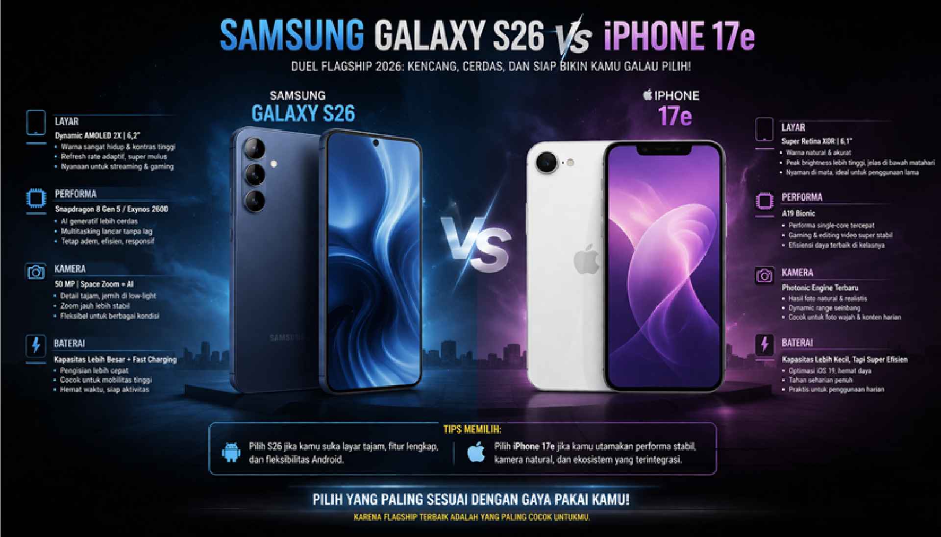 Samsung Galaxy S26 vs iPhone 17e, duel flagship 2026 yang bikin bingung pilih tim performa ngebut atau tim hasil kamera natural?-Gambar Ist-