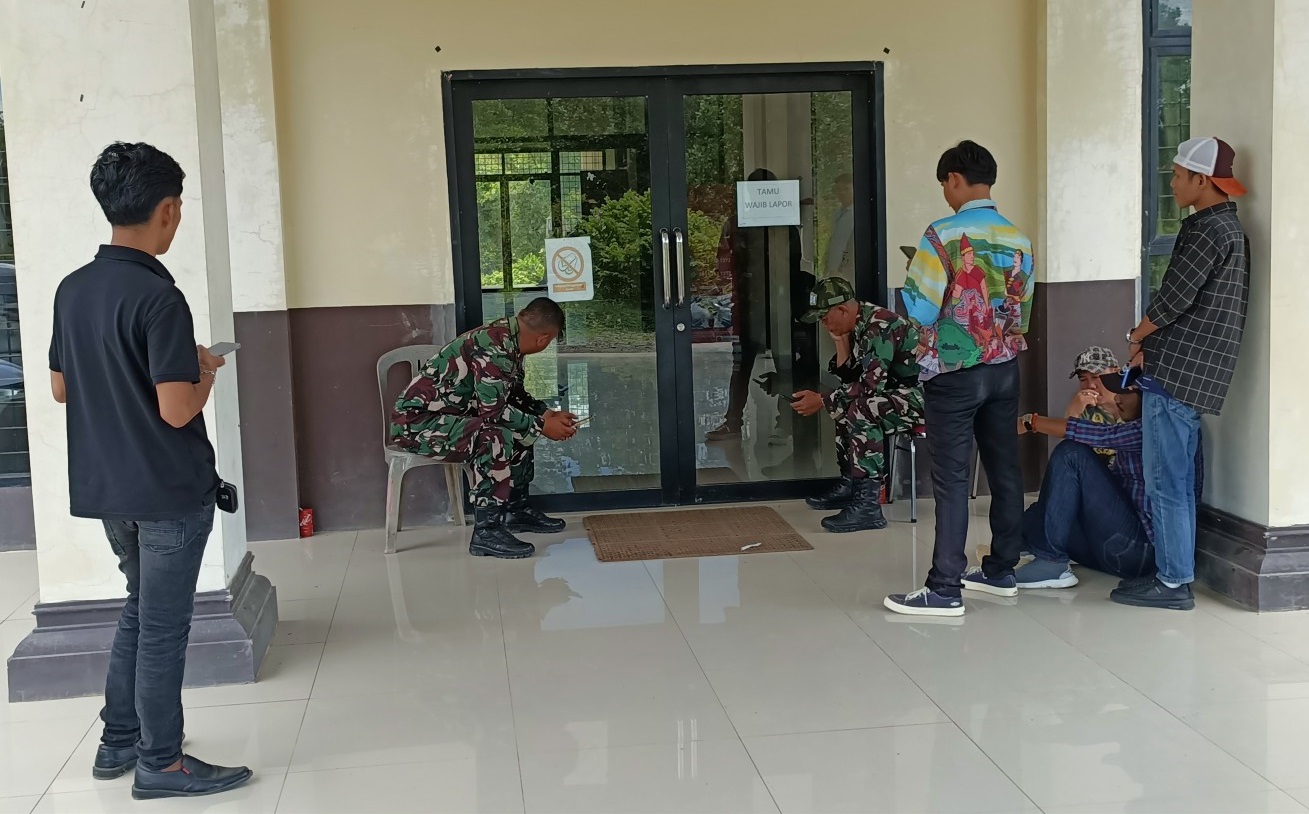Selama pemeriksaan, pintu masuk utama Kantor Dinas Perkim di tutup dan dijaga 2 orang anggota TNI, sementara di pintu belakang dijaga 4 anggota TNI.
