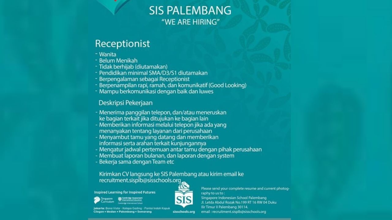 Lowongan Kerja Receptionist Palembang di SIS Palembang 2026, Cek Syarat dan Cara Daftarnya!