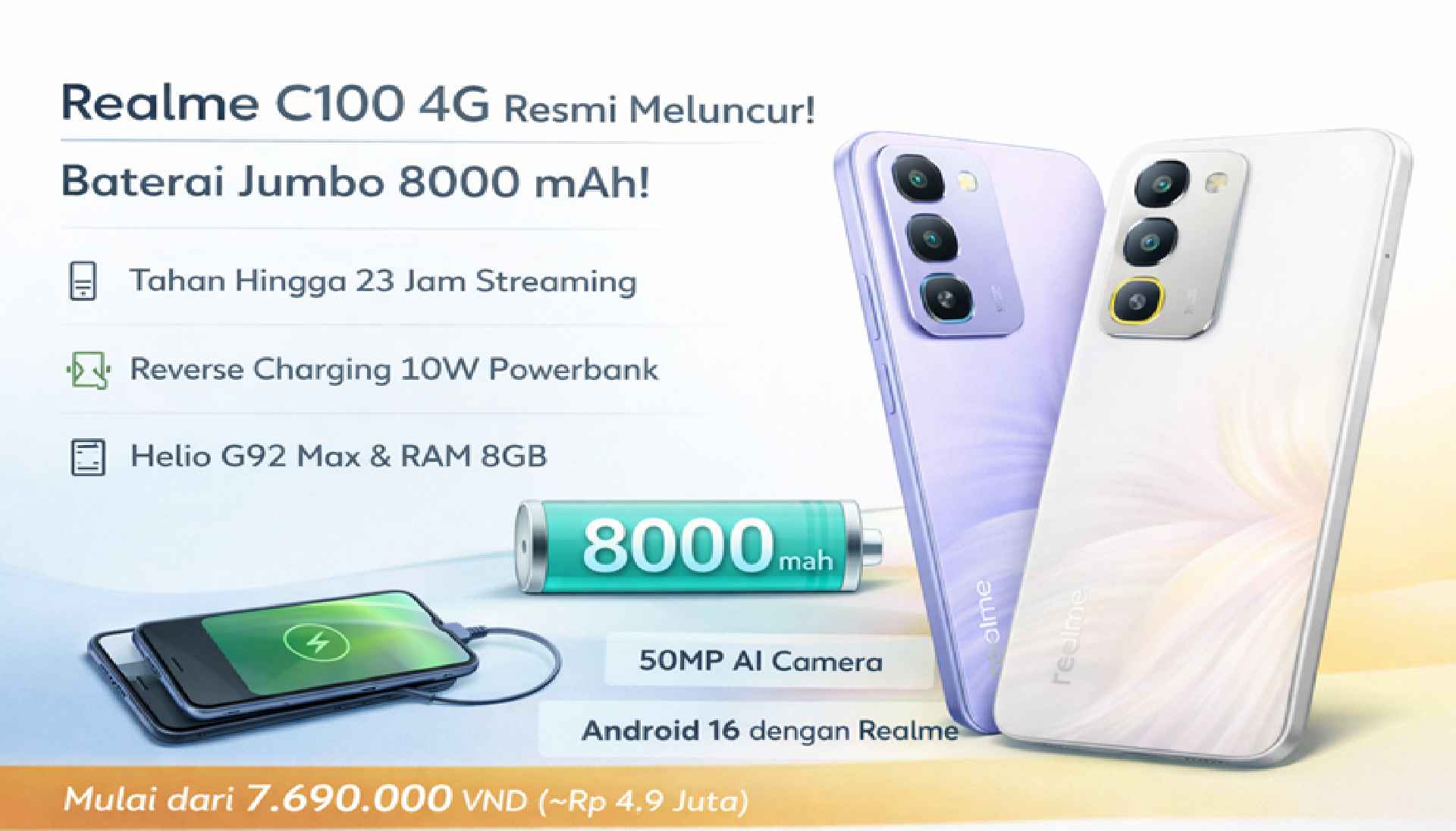 Realme C100 4G Rilis! Dibekali Baterai 8.000 mAh dan Fast Charging 45W, Bisa Jadi Powerbank Praktis