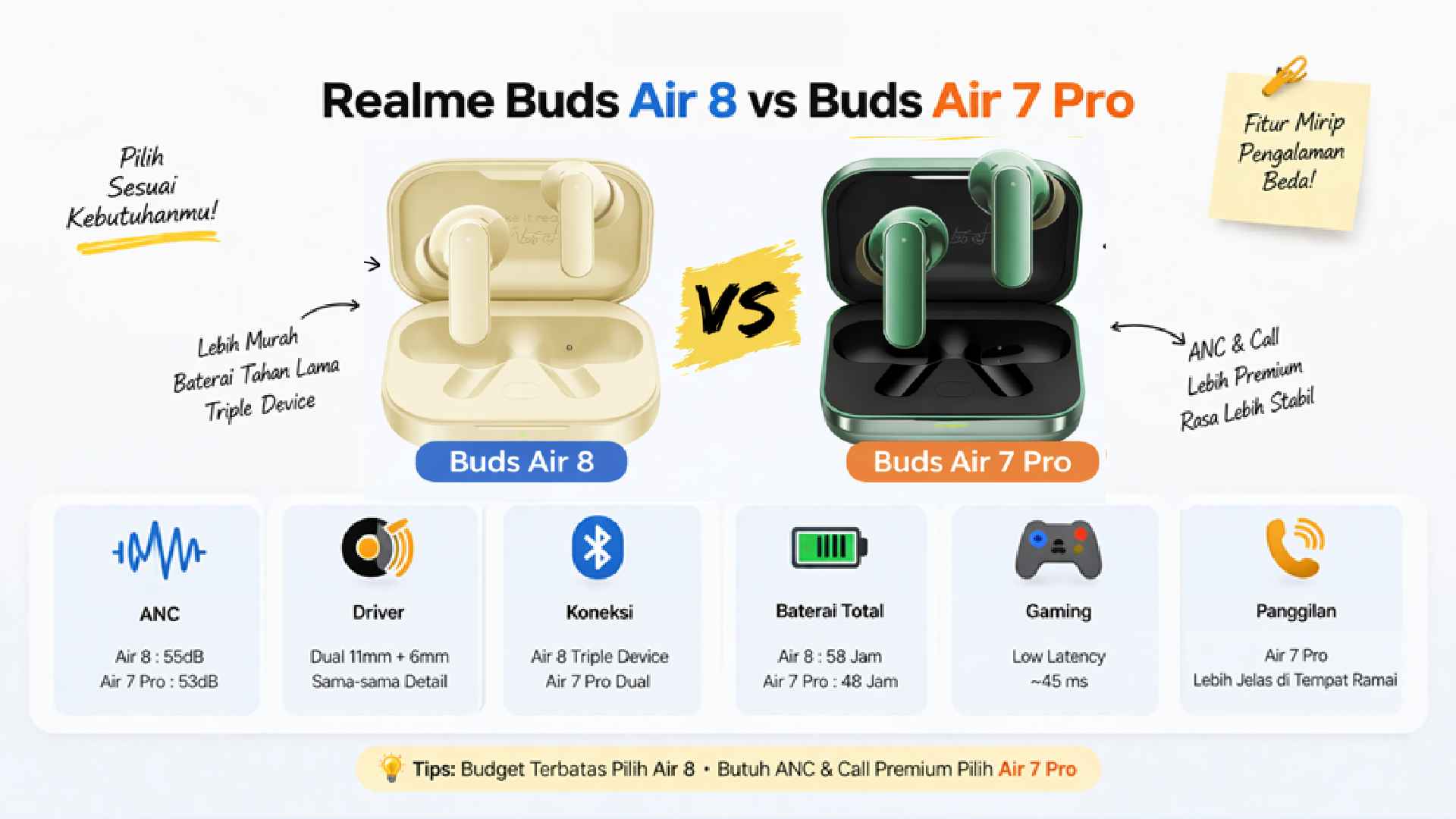BACAKORAN.CORealme Buds Air 8 vs Buds Air 7 Pro langsung jadi perbincangan karena selisih harga cukup jauh tapi fitur terlihat mirip.