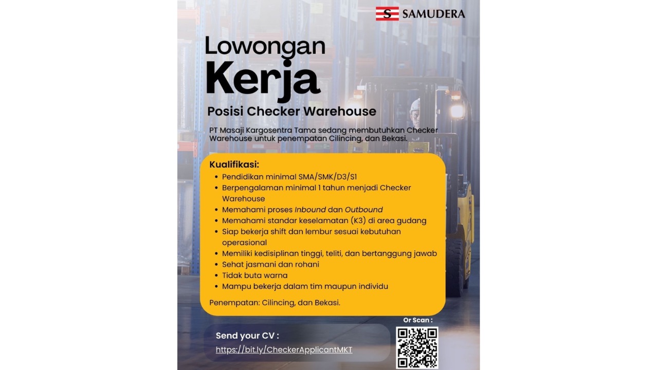 BACAKORAN.CO - Info loker Checker Warehouse PT Masaji Kargosentra Tama 2026 resmi dibuka bagi kamu yang memiliki pengalaman di bidang logistik dan pergudangan.