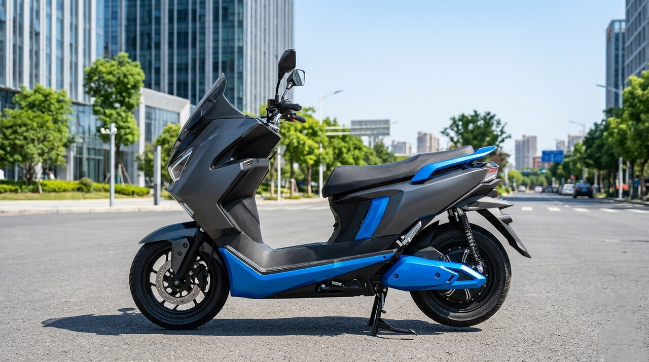 Skuter listrik maxi canggih: Abu-abu tua dengan aksen biru elektrik, siap untuk mobilitas perkotaan yang modern dan ramah lingkungan. --AI