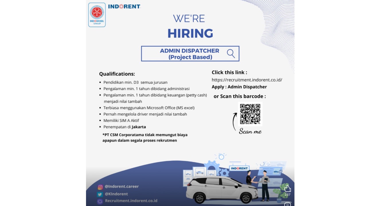 BACAKORAN.CO - Info loker Admin Dispatcher Indorent 2026 resmi dibuka untuk kamu yang ingin berkarier di perusahaan otomotif ternama.