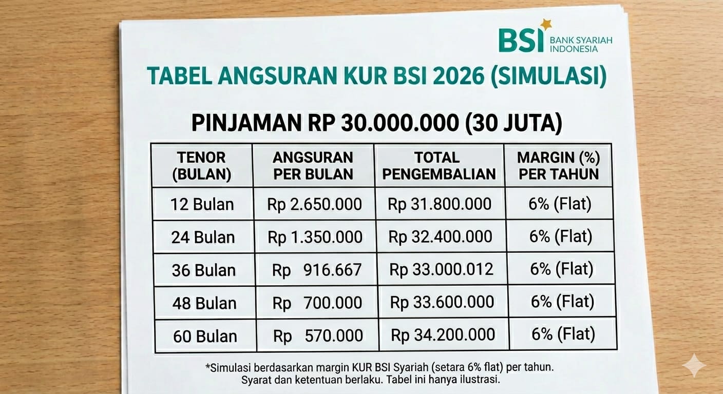 Simulasi Tabel Angsuran KUR BSI 2026 Rp 30 Juta